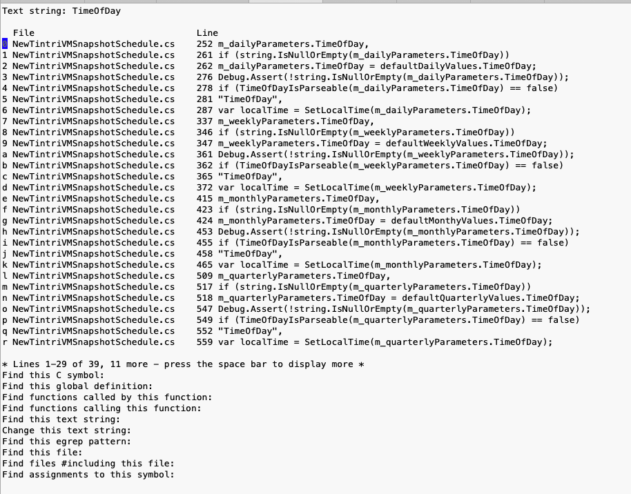 Cscope search results are invisible https://datastorageguy.com/2024/02/13/cscope-search-results-are-invisible/ Tue, 13 Feb 2024 21:58:59 +0000 https://datastorageguy.com/?p=286 Part of my 'day job' is trolling thru source code when looking for answers. My preferred mechanism, other than a recursive grep, is to use cscope